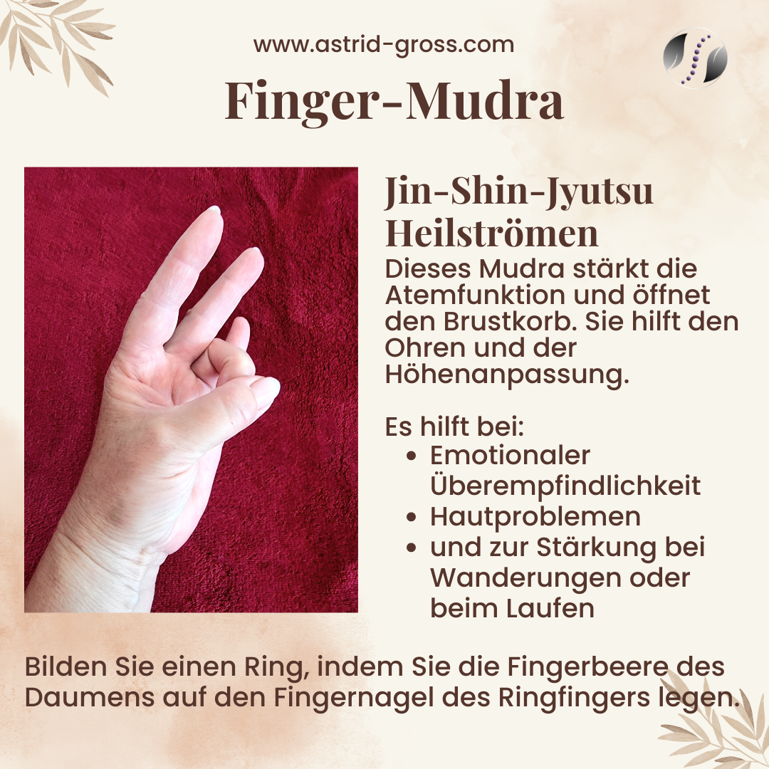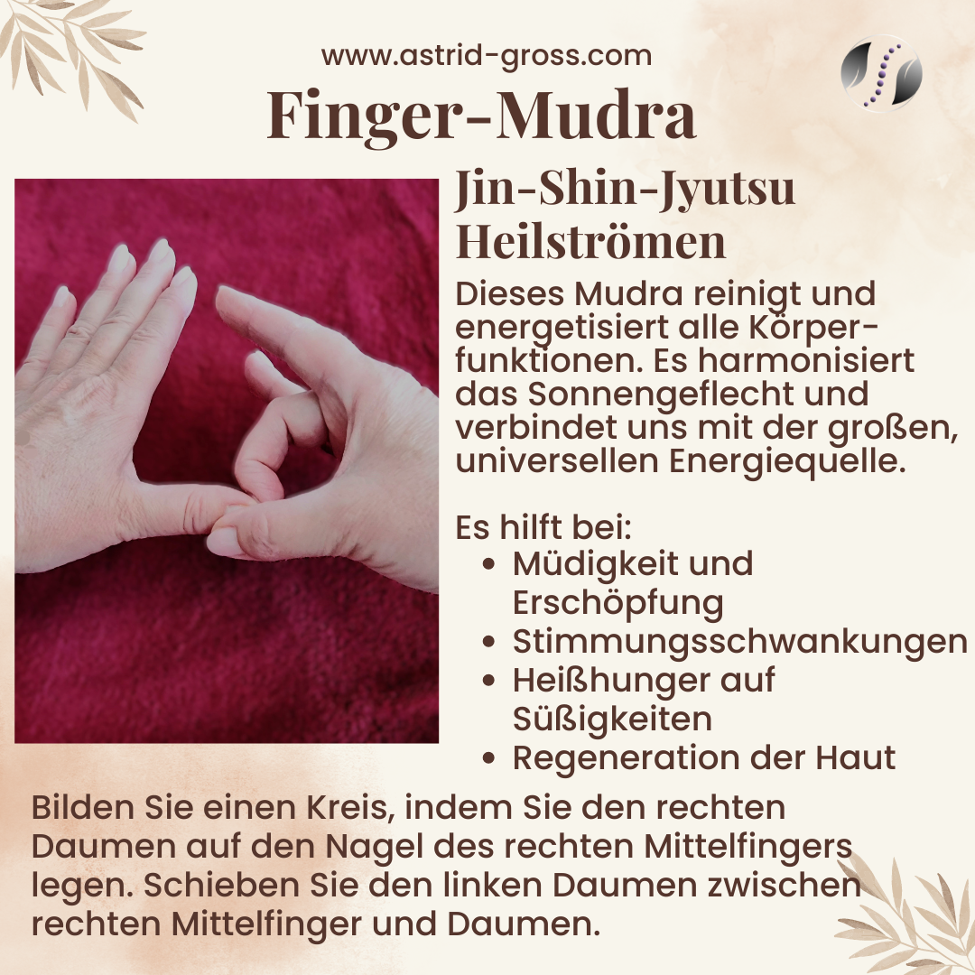 Dieses Mudra erfrischt Körper und Seele, es reinigt und erneuert. Es löst Stress, Ängste, Sorgen und Ärger.